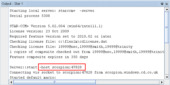 当 Simcenter STAR-CCM+ 启动新服务器时,它以符合 Simcenter STAR-CCM+ 启动命令所需语法的形式在输出窗口中显示主机名和端口号。