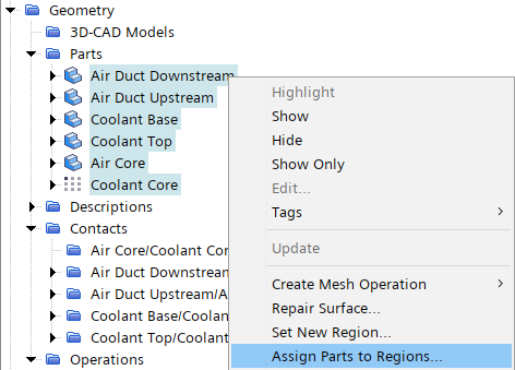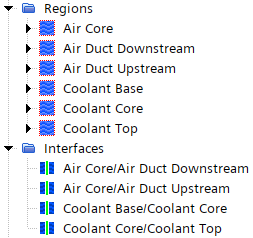 为热交换器的每个部件创建一个区域,生成六个区域:两个用于风管,两个用于冷却液,两个用于热交换器中心。通过将所有热交换器部件同时分配给区域,将根据接触创建独立区域之间的交界面。