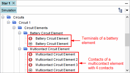 - 端子和触点可连接不同的电路元件或接地。除多触点电路元件之外的其他所有电路元件具有正负极端子。具有 n 个触点的多触点元件具有一个负触点和