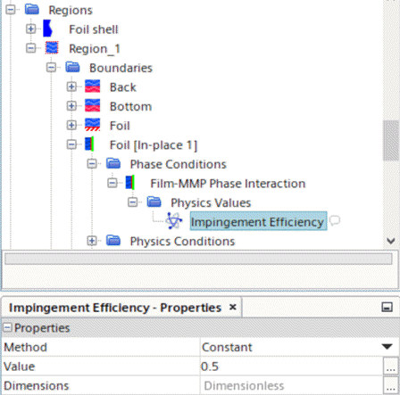 要在混合多相流模拟中对欧拉相的液滴碰撞建模,需要设置液膜-MMP 相间相互作用。然后激活入射碰撞质量通量模型并指定相应的碰撞效率。碰撞效率是指碰撞液膜边界(从欧拉相传输到液膜)的总质量的分数。