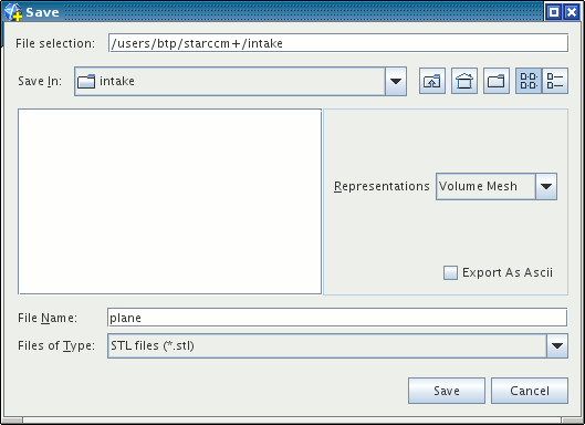 在保存对话框中,输入 .stl 或 .vtk 文件的名称,并确保在菜单中选择正确的表示。 默认情况下,文件以二进制格式保存。 要以 ASCII 格式保存文件,勾选导出为 ASCII 复选框。