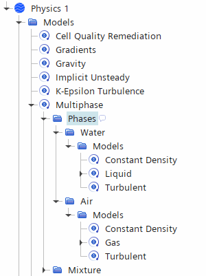 定义欧拉相 使用 VOF 多相模型需要为水和空气创建欧拉相。 要定义欧拉相: 右键单击连续体 > 物理 1 > 模型 > 多相 > 相节点并选择新建。 将相 1 重命名为水。 右键单击相 > 水 > 模型节点并选取选择模型... 在水模型选择对话框中: 从材料组合框中选择液体。 从状态方程组合框中选择恒密度。 单击关闭。 右键单击连续体 > 物理 1 > 模型 > 多相 > 相节点并选择新建。 将相 1 重命名为空气。 右键单击相 > 空气 > 模型节点并选取选择模型... 在空气模型选择对话框中: 从材料组合框中选择气体。 从状态方程组合框中选择恒密度。 单击关闭。