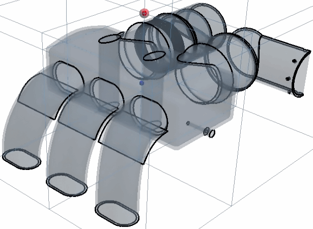 在定位点面板中,将当前点设为源点,然后使用图形窗口中的点工具将源点(小蓝球)定位在歧管体的中间(大致坐标为 X=0、Y=0.12 和 Z=-0.01)。