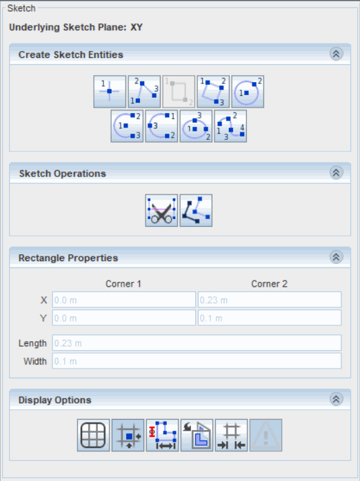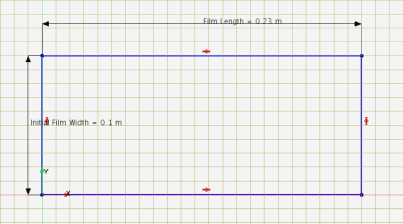 您创建的几何体是一个矩形,其宽度对应于液膜的初始宽度的一半(因此为 0.1 m),长度是液膜长度,0.23 m。在 X-Y 平面上专门创建矩形草图并在 Z 方向拉伸,以便以后可以在 Z = 0 的 X-Y 平面上创建 2D 网格。