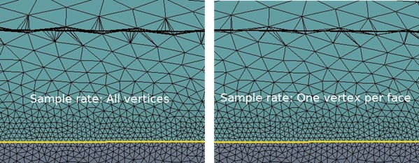对于高质量的表面,默认行为(全部节点)在投影边的连续性/光顺性方面可提供最一致的结果。但是,根据局部面网格质量和三角形尺寸从一个面到下一个面的变化,其他采样率可能更合适。跳过更多节点时,遇到反转边(结果中相互交叉的边)的机会降低。对于复杂几何,可能需要一些迭代才能获得良好的结果,特别是通过使用不同的采样率选项。以下示例显示了采样率对包含网格重构的网格表面产生的效果比较,该网格重构在高梯度区域到低梯度区域之间的差异很大。尽管这两个采样率都提供良好的投影结果,但每个面一个节点结果的压印的三角形化减小使得其成为更好的选择 - 因为结果包含的三角形较少,而边保真度不会明显损失。在下游网格器中使用时,这需要的清理更少。