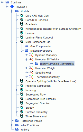 要显示此方法,为多组分气体或液体选择材料属性 > 分子扩散率节点,然后将方法设为二进制扩散系数。 此时将显示节点。