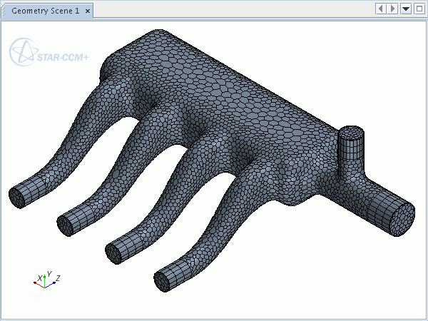 注 创建此体网格时,用拉伸网格在各平均区生成矩形网格单元。此网格有助于捕获这些区中的流体的一维特性。 Simcenter STAR-CCM+ 在输出窗口内提供有关导入过程的反馈,并在区域节点下创建一个网格区域。