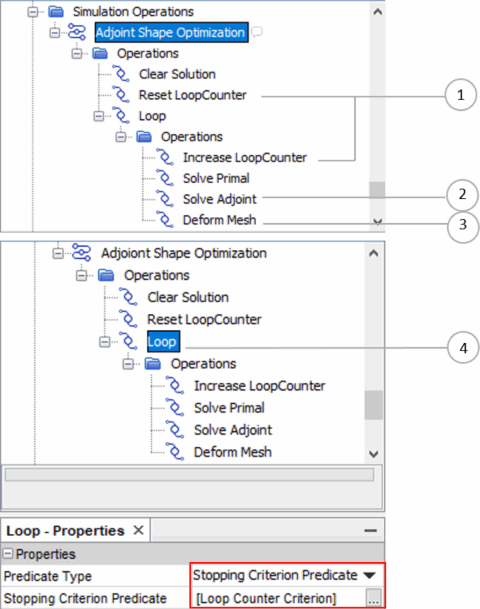 定义一个循环操作,其中包括一个原始求解物理操作、一个求解伴随操作和一个变形网格操作。当达到用户自定义的优化循环数时,将循环设为停止。