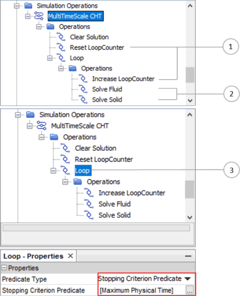 定义一个循环操作,其中包括两个求解物理操作 - 每个连续体对应一个。每个求解物理操作都会对其关联连续体运行求解器,直到满足其求解器特定的停止准则。满足全局停止准则后,循环停止。