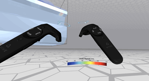 Simcenter STAR-CCM+ Virtual Reality 旨在与不同的虚拟现实耳机配合使用,以在 3D 空间中捕捉您的动作。耳机配有两个无线控制器,在虚拟现实环境中充当虚拟手。这两个无线操控手柄提供多种输入方法,包括扳机、按钮和追踪板。