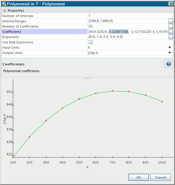 还可以选择单位。 输入单位属性指定 x 轴的单位,输出单位属性指定 y 轴的单位。 与常数值不同,更改单位时,多项式系数和多项式范围(因此还有多项式绘图上的 x 和 y 轴)不会重新进行比例缩放。 在使用此多项式计算物理量时,Simcenter STAR-CCM+ 会将这些单位选择用作所用单位的指示器。
