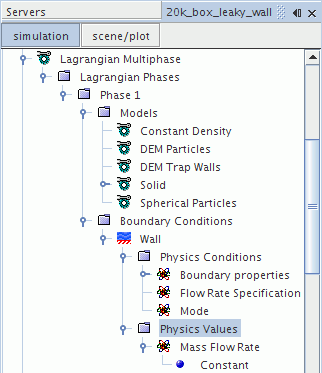 可以在“物理值”节点中指定 DEM 颗粒离开边界的速率。质量流率、体积流率或颗粒流率被指定为标量分布。