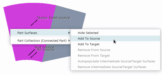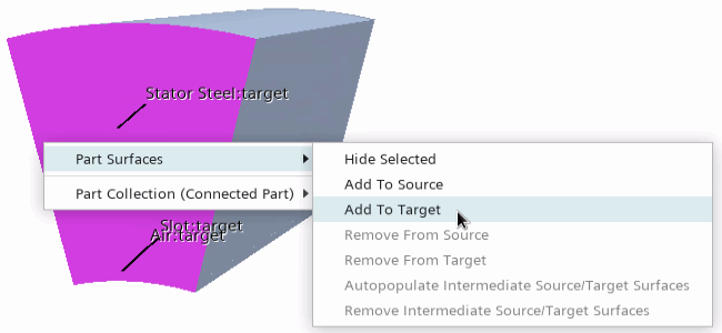 您可以使用块网格化同时构造 Air、Slot 和 Stator Steel 零部件的网格。块网格化要求您在源表面上手动创建块。Simcenter STAR-CCM+ 使用这些块来生成四边形面网格。这三个零部件之间有已定义的接触,从而可在一个定向网格操作中一起使用这些零部件。
