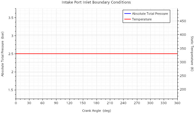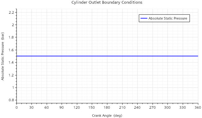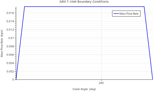 空气通过进气口入口进入,静态温度为 330 K,压力为 2.5 bar。在 GAV 的入口处,引入总温度为 330 K 的甲烷气体,其中进入的气体开始于 230.0 度 CA 并结束于 246.0 度 CA。您将导入一个将甲烷气体的质量流率描述为曲柄角度函数的表。要避免流量在 GAV 入口处扩散,可排除流边界扩散通量。在排气口出口处,将压力设为 1.5 bar 并将静态温度设为 700 K。