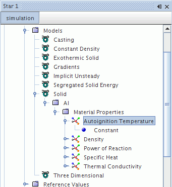 使用自燃温度 当激活放热固体模型时,可以指定自燃温度作为材料属性。在以下屏幕截图中,示例显示可在连续体 > 物理 > 模型 > 固体 > Al > 材料属性节点中访问此属性。 对于计算方法,选择常数值 (K) 或用户自定义场函数。