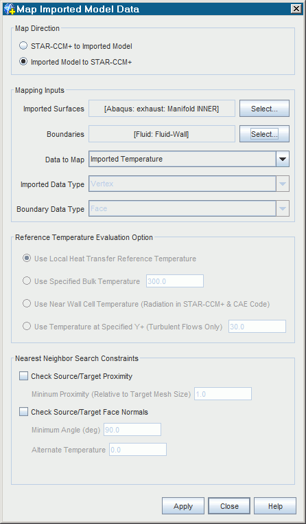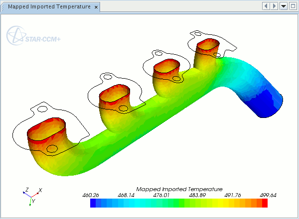 以下示例中的设置指定了导入的温度数据将从导入的 Abaqus 模型的 Manifold INNER(歧管内部) 表面映射到 Simcenter STAR-CCM+ 模型的流体壁面边界。