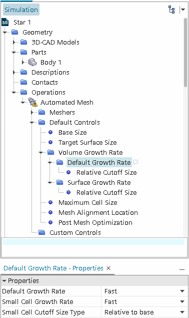 If the Size Dependent Growth Rates is set to Small and large cells, for the Trimmed Cell Mesher meshing model (see Trimmed Cell Mesher Reference), the Volume Growth Ratenode has no properties of its own. Instead, it has two child nodes, one for the Default Growth Rate, and another for the Surface Growth Rate.