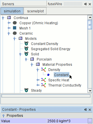 指定 Ceramic 材料特性 现在指定陶瓷的材料特性。 指定材料特性: 将 Ceramic > 模型 > 固体 > Al 节点重命名为 Porcelain。 选择 Porcelain > 材料特性 > 密度 > 常数节点,然后将值设置为 2500 kg/m^3。 选择比热 > 常数节点,然后将值设置为 1080 J/kg-K。 选择导热率 > 常数节点,然后将值设置为 0.928 W/m-K。