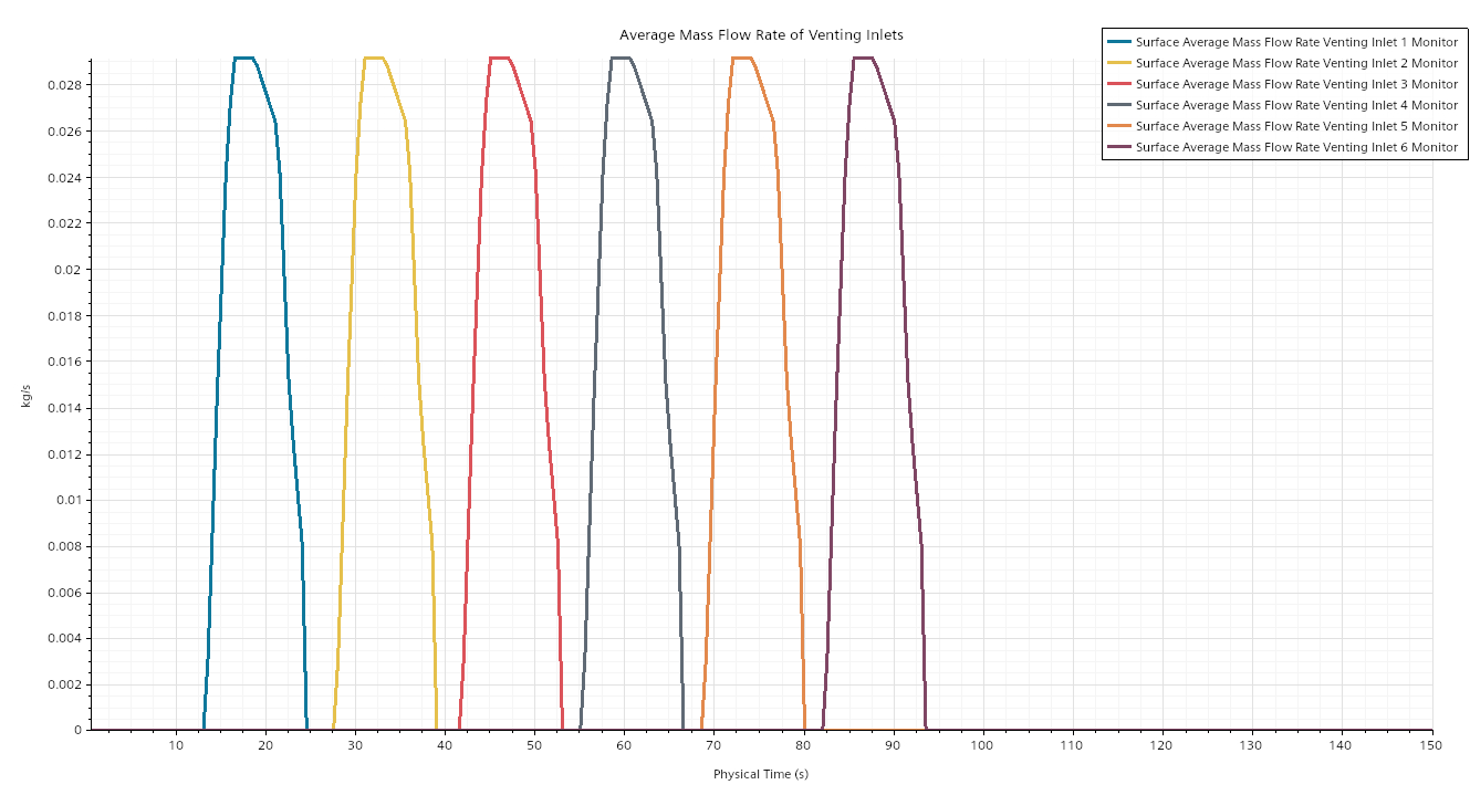 热失控在电池中大约 9.0 s 后开始,随着内部温度上升,电池将分解。由于分解,产生了气体并通过通风入口排放。由于通风入口明确存在的质量流率,通风从 12.5 s 开始,随着气体的排放,质量流率迅速增大。当大约 25.0 s 左右在第一个入口完成通风时,质量流率会迅速降低。然后在其余通风入口重复此模式,所有通风在大约 95.0 s 左右完成。