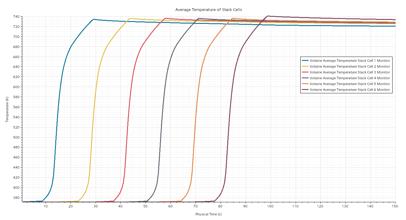 在大约 9.0 s 的物理时间之前,第一个电池电芯的平均温度会从其初始温度 371.15 K (98 °C) 略微升高,直至达到触发温度 373.15 K (100 °C)。然后,可以看到温度急剧升高时热失控模型的影响。一旦叠片电芯温度达到最大值约 734.0 K (460.85 °C),叠片电芯就开始缓慢降温。通过热传播,其他电池电芯依次升温并经历热失控。