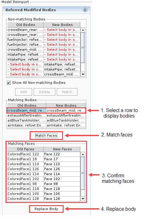 在某些情况下,“重新导入模型”会正确匹配新旧体对,但无法找到所有面的匹配。在这种情况下,引用的修正的体面板包含另一个列表,名为非匹配面。
