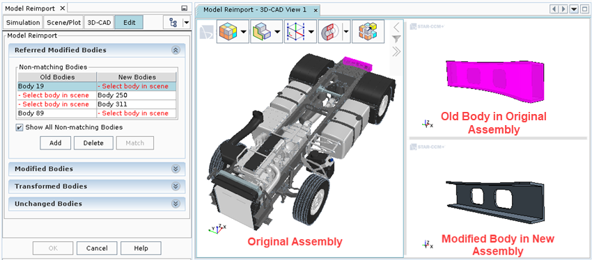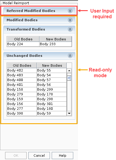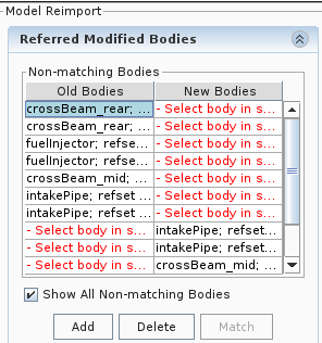 - 包含已在新装配中修改、添加或删除的体,以及为成功完成重新导入过程而需要输入内容的体。面板的此部分中会出现两个表 — 非匹配体和匹配体。