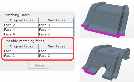 对于某些体对,重新导入过程会正确匹配新旧体,但需要确认面之间的映射正确。在这种情况下,引用的修正的体面板包含一个名为匹配体的后续列表,必须为其确认面映射。