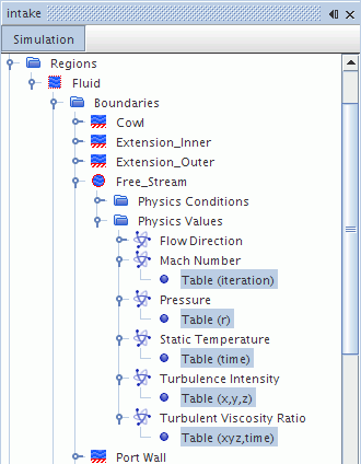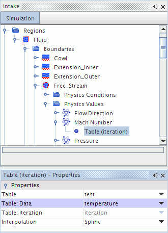 将分布法指定为表之后,打开分布节点(以下屏幕截图中的马赫数)。 如有必要,选择表格节点。 从表:数据和表对应的下拉列表中,设置适当的属性。 必须将表读入 Simcenter STAR-CCM+ 才能进行此选择。否则,这些下拉列表为空,且表:数据和表属性显示为空值。 其他属性(以下屏幕截图中的表(迭代))为只读,因为它仅指示表格法所需的列标题。