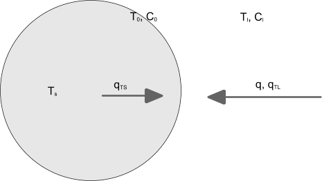 颗粒内部的温度为 。在交界面中,溶质浓度为 ,其对应温度为 。在液体中,温度为 ,溶质浓度为 。表面溶质的质量通量 由晶体增长率 平衡。热将从液体和颗粒内部传递到表面:相应的通量为 和 。