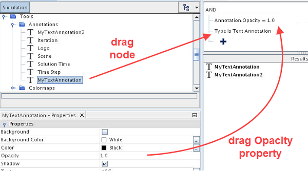 为了将结果限定为简单文本注释,将简单文本注释节点拖到查询编辑器。在该编辑器中,已定义初始谓词 [Annotations.Opacity = 1.0]。 此时,获得复合谓词: