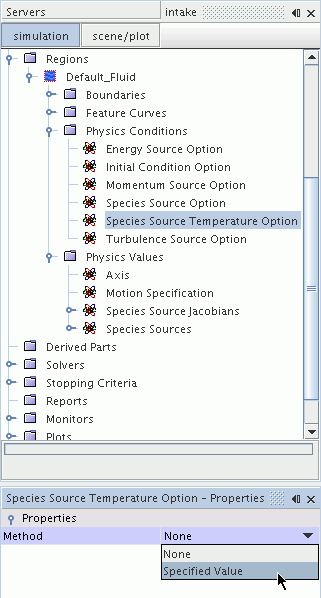 此节点可用于指定用户组分源的温度。 Simcenter STAR-CCM+ 会添加与用户组分源的质量和此温度对应的能量大小。 默认选项使用以开尔文为单位设置的固定温度值。 “标量分布属性”一节中描述了替代选项。
