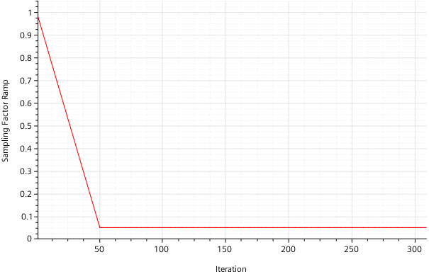 For this tutorial, you set up a linear ramp that starts with a sampling factor of 1.0, reduces to a value of 0.05 during the first 50 iterations, and then remains constant until the simulation completes: