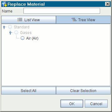 - 尝试选择新材料模型或替代材料模型时,将显示一个空选择对话框,其中仅包含在之前保存的模拟中选择的任何材料。(在此示例中,模拟文件仅包含材料空气。)
