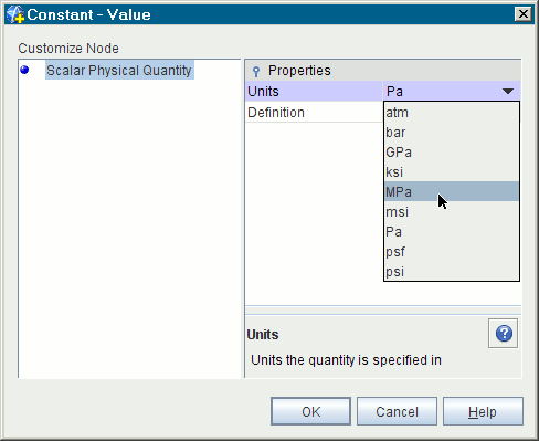 进行一次切换后,将拥有添加的选项,以更改单个数据库材料属性值所用的单位。要针对特定值访问此选项,在节点的值属性中单击属性自定义工具 (