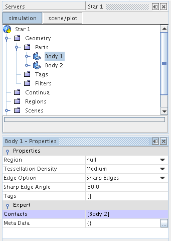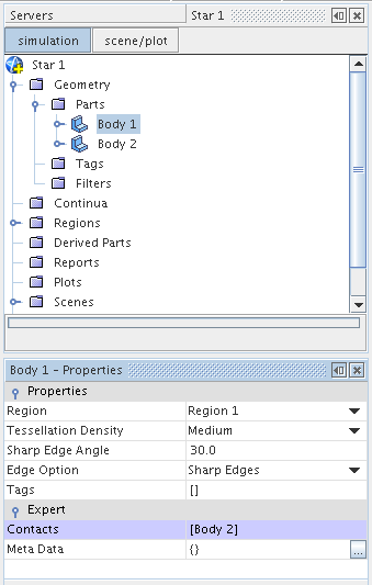 在以上示例中,Body 2(体 2) 零部件添加为 Body 1(体 1) 零部件的接触。 选择 Body 2(体 2) 零部件节点会将 Body 1(体 1) 显示为接触。 如有必要,可以编辑零部件接触列表。
