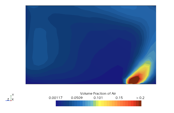 This scene displays the mass flow rate of the escaping air bubbles through the phase-permeable wall. The faster moving bubbles are concentrated near the right side of the bubble plume.