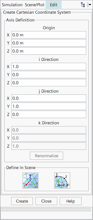 完成参数设置后,单击重新标准化按钮可应用输入项。单击创建将坐标系添加到模拟树,然后单击关闭。或者,单击关闭以取消创建过程并放弃所有设置。