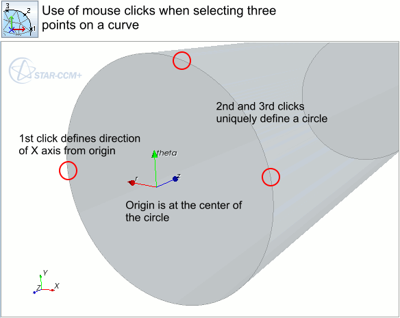 右侧的图标可激活用于指定圆上三个点的工具。应该单击非共线的三个点,以唯一地定义圆。新坐标系的原点位于此圆的中心。X 轴指向第一次单击,Z 轴垂直于圆的平面并且其方向由定义点的顺序确定。在下面显示的示例中,从第一次单击开始,以顺时针方向进行三次单击。