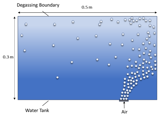 This tutorial demonstrates the workflow for setting up a degassing boundary for a simplified aeration tank with a length of 0.5m, a width of 0.1m, and a height of 0.3m. The tank is completely filled with water. The air enters the tank at a velocity of 5 m/s through a perforated plate that has an open area of 4%. Only air can leave through the top of the tank.