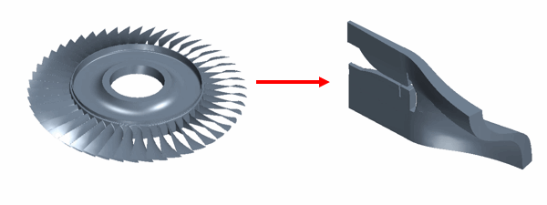对于具有不同类型叶片(如完全叶片和分流叶片)的径向几何,可以通过在流体域中包括这两种类型的叶片来创建周期流体域。如果径向几何仅包含一种类型的叶片,则可创建包含单个叶片的周期流体域。