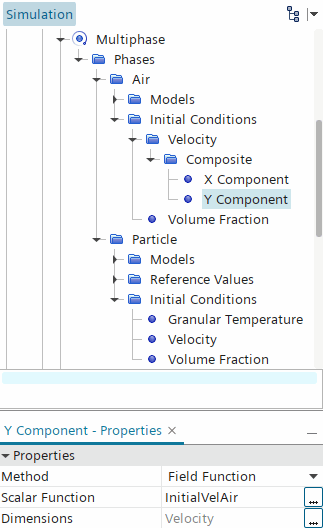 Use the same procedure to create field functions for the initial air volume fraction and the initial velocity of air, using the details below: