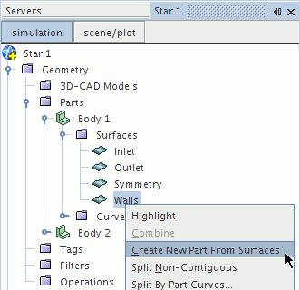 右键单击属于同一零部件的一个或多个表面节点,然后在弹出菜单中选择根据表面创建新零部件: