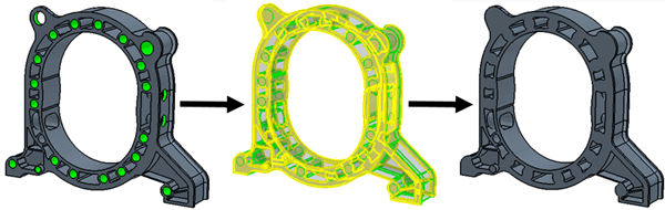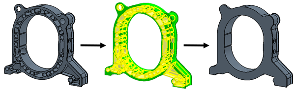 3D-CAD 中的去特征函数可用于从几何中移除不需要的特征。不需要的特征可能包含面、孔、突起、倒角和圆角。去特征函数还可以将分割表面合并为单个表面。