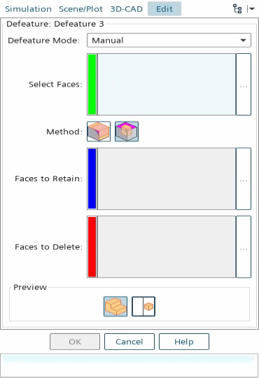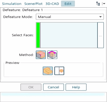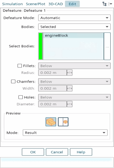 - 在对话框中进行更改时,观察 3D-CAD 视图场景中显示的预览。该预览会更新,以显示应用相关操作时将更改的内容,具体取决于为模式选择的选项。
