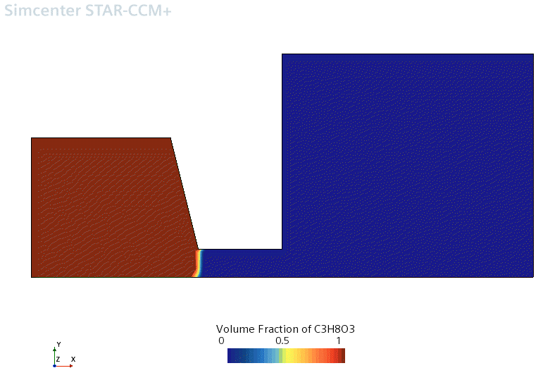 和预期一样,运行初期,整个左腔室注满甘油,而右侧腔室和连接通道完全注满空气。在两个流体之间的交界面可以看到有一块小区域明显存在两种流体,但这种效果是由于网格的粗糙度而造成的。