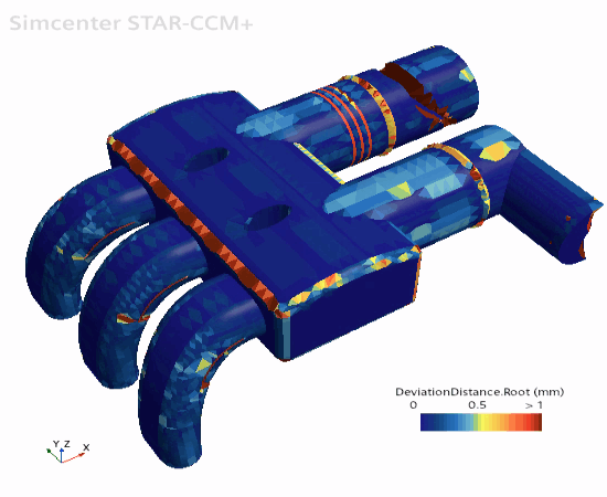 The Deviation Distance field function, which is available when the Surface Wrapper model is active, displays the amount by which the surface wrap deviates from the original geometry.Simcenter STAR-CCM+ calculates the deviation distance displays this in the scalar scene. The calculation can take time, depending on the complexity of the geometry.