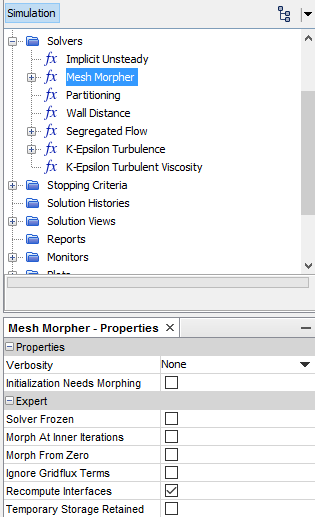 - 变形将在时间步期间内的每次内部迭代时更新网格位置。此操作仅在某些边界条件取决于求解的情况下才有意义;为了降低计算成本,该操作默认情况下为关闭状态。对于 FSI,如果在运行模拟时该设置最初被设为取消激活,那么只要与流体-固体交界面相邻的网格单元的体积发生巨大更改,流体结构耦合求解器就会激活该设置。