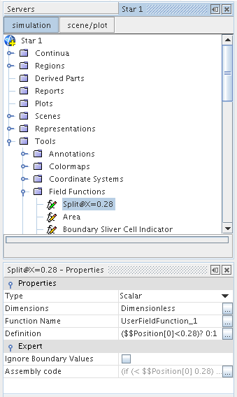 使用任意方法查找分割的 X 位置 - 对于这种情况,将使用值 0.28。使用节点创建名为 的新用户场函数,然后将定义设为 ($$Position[0]<0.28)? 0:1。