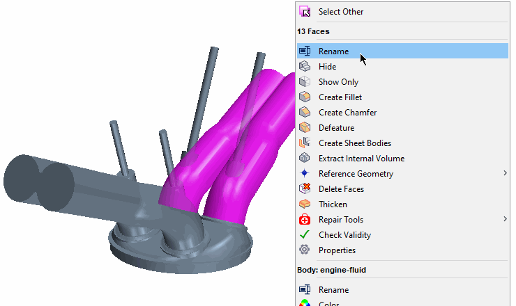 如果导入的 CAD 几何的体和面名称不符合 Simcenter STAR-CCM+ In-cylinder 命名约定,可以对其重命名。体在 Simcenter STAR-CCM+ In-cylinder 对象树中重命名。要重命名面,必须在 3D-CAD 中编辑导入的 CAD 几何。