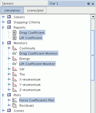 下面是显示全部三种对象类型的对象树示例。 在此特定示例中,已使用曳力和升力系数报告来创建监视器,而监视器转而又被用在称为力系数绘图的单个绘图中。